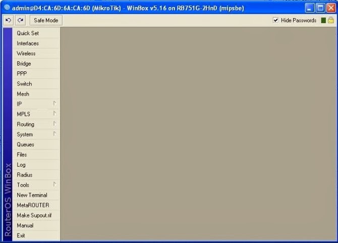Pada pilihan Connect to isikan MAC adress saudara. Karena pertama setingan belum ada IP addressnya. Jadi untuk konfigurasi awal isikan MAC address saja. Lalu pilih button Connect. Maka setelah di connect akan muncul interface awal mikrotik seperti gambar dibawah ini...
